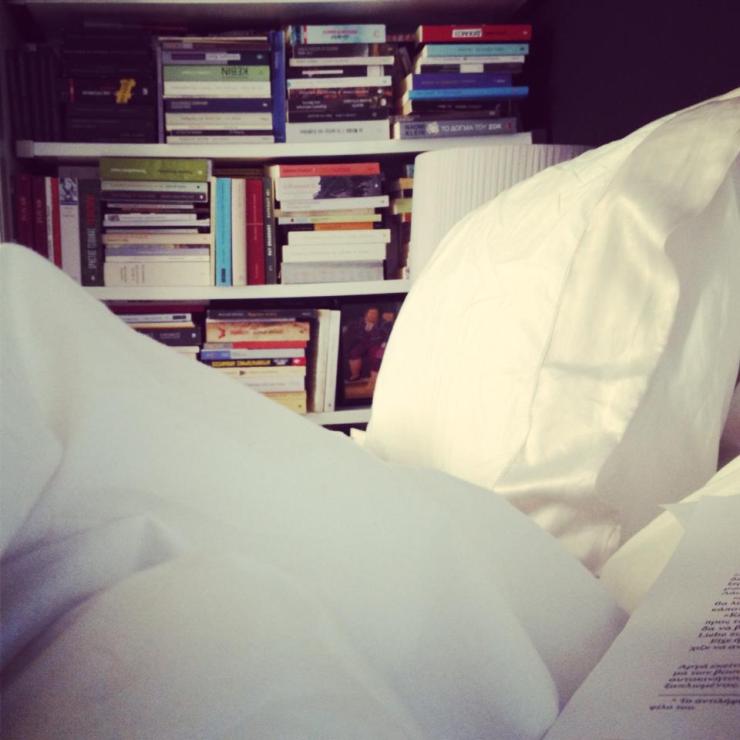 Αυτή η φωτογραφία είναι από τις πιο αγαπημένες μου. Αφράτα λευκά μαξιλάρια σαν σύννεφα και πολλά βιβλία… Μια εικόνα που ενσαρκώνει την ερωτική σχέση που έχω με το διάβασμα. Δεν είναι τυχαίο που επέλεξα να τοποθετήσω μια σειρά από ράφια δίπλα στο κρεβάτι μου. Μια άτακτη βιβλιοθήκη με διπλές και τριπλές σειρές, με τους τίτλους μπερδεμένους σε στοίβες που αλλάζουν θέση σχεδόν καθημερινά… Ένα μικρό χάος μέσα στο οποίο βυθίζομαι κάθε φορά που ψάχνω ένα συγκεκριμένο βιβλίο. Κι όταν το βρίσκω, τι ηδονή!