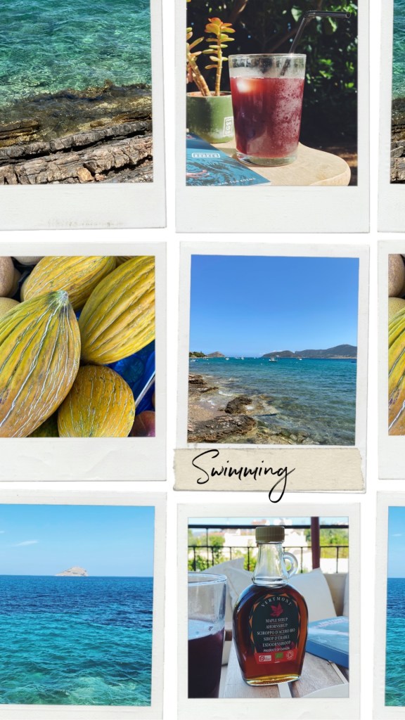 Σήμερα, όμως, αποζημιώθηκα. Ξύπνησα ήσυχα και ήπια τον καφέ μου στον κήπο μέχρι αργά. Πήγαμε βόλτα στη θάλασσα με τον Hermes και τη Σοφία όπως κάθε πρωί και μετά πήγα περπατώντας για μια σύντομη βουτιά κοντά στο σπίτι. Μου αρέσει να πηγαίνω μόνο για κολύμπι και να επιστρέφω με βρεγμένα μαλλιά για να στεγνώσω στη σεζλόνγκ του κήπου, διαβάζοντας και πίνοντας παγωμένες βυσσινάδες.