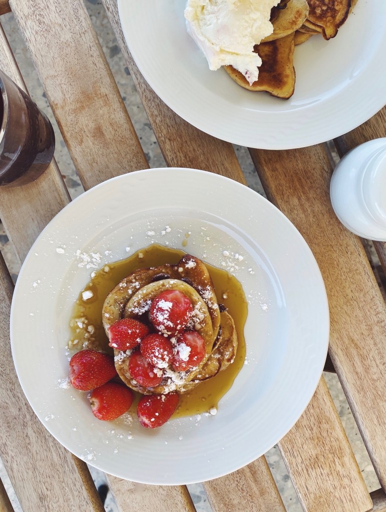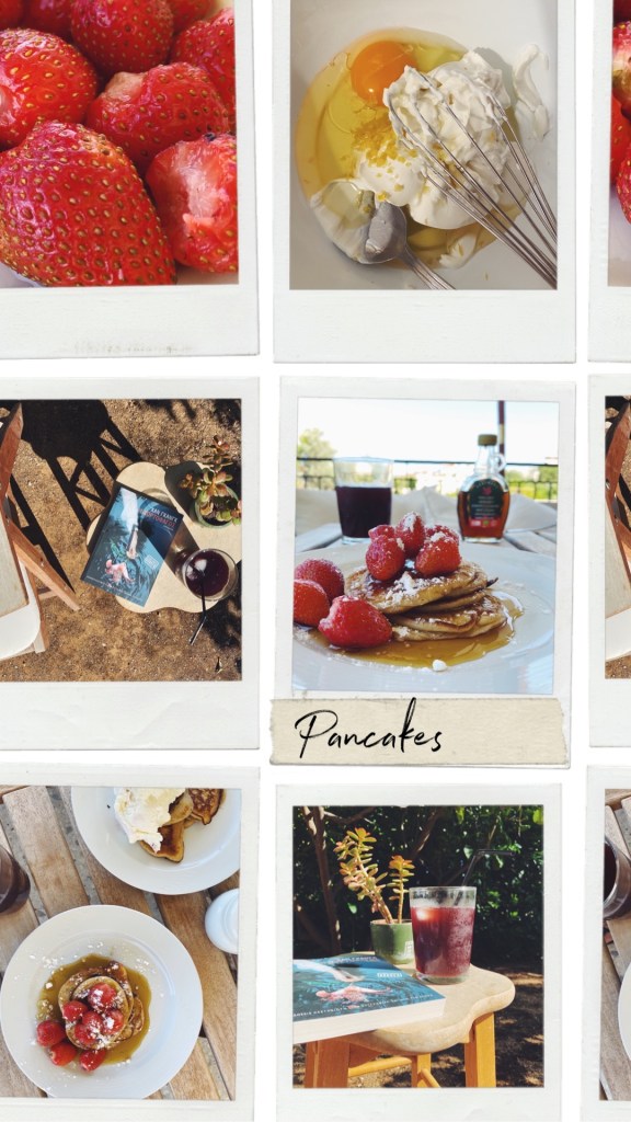 Στο σπίτι με περίμενε μια έκπληξη! H Σοφία είχε φτιάξει brunch: pancakes με φράουλες και σιρόπι σφενδάμου, σπιτικά burgers με fried chicken και σαλάτα με μαρούλια από το μποστάνι μας. Στρώσαμε τραπέζι έξω, στη βεράντα, πλάι στη μπουκαμβίλια και καθίσαμε έτσι όλο το απόγευμα μέχρι που έπεσε το σκοτάδι.