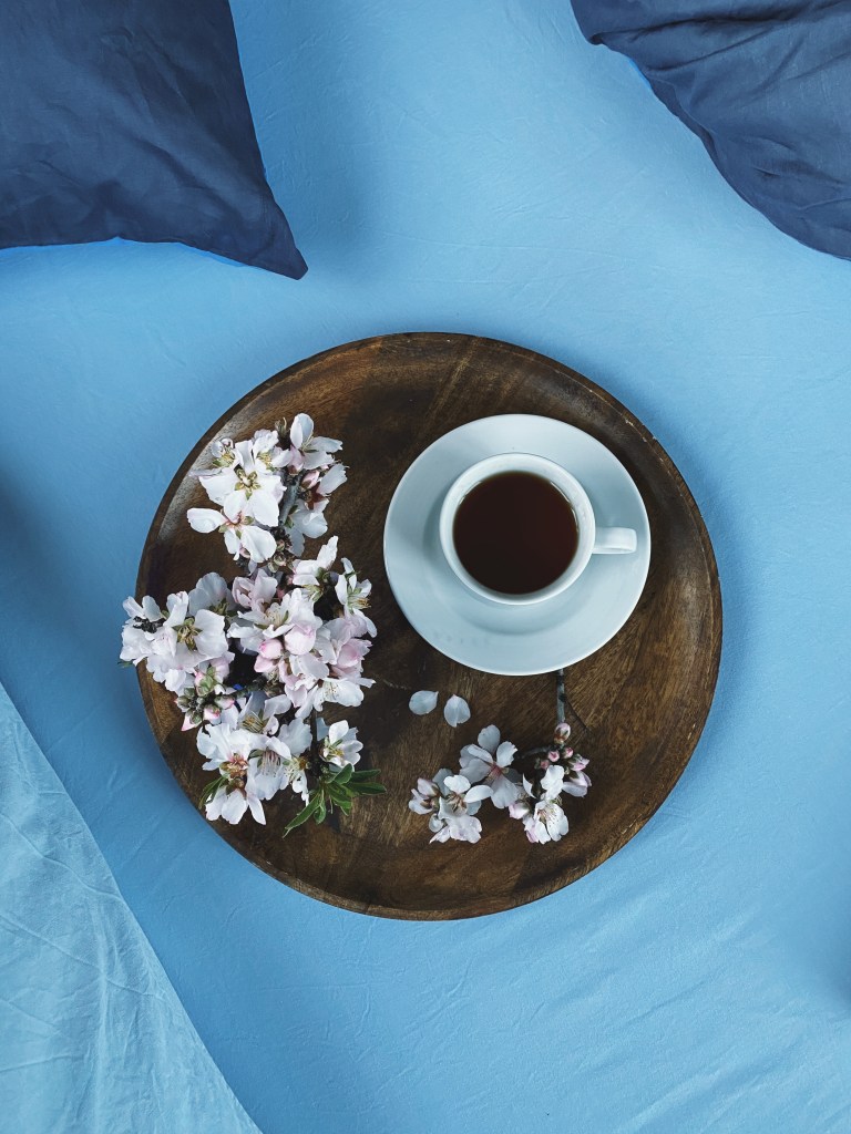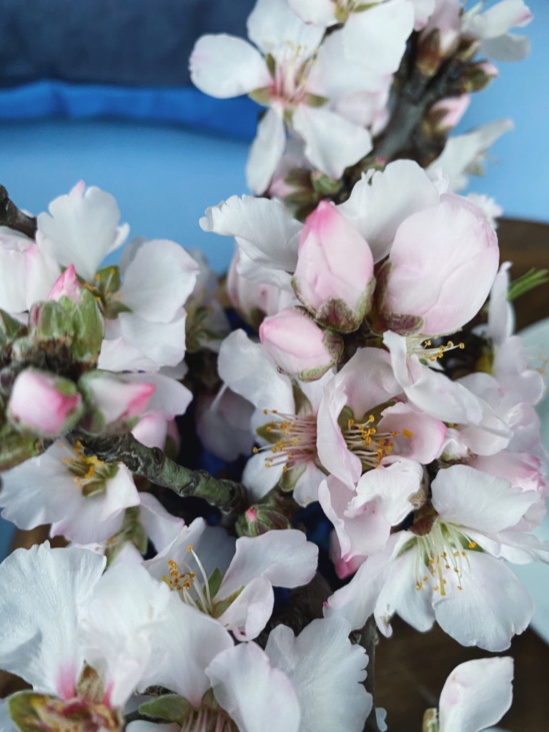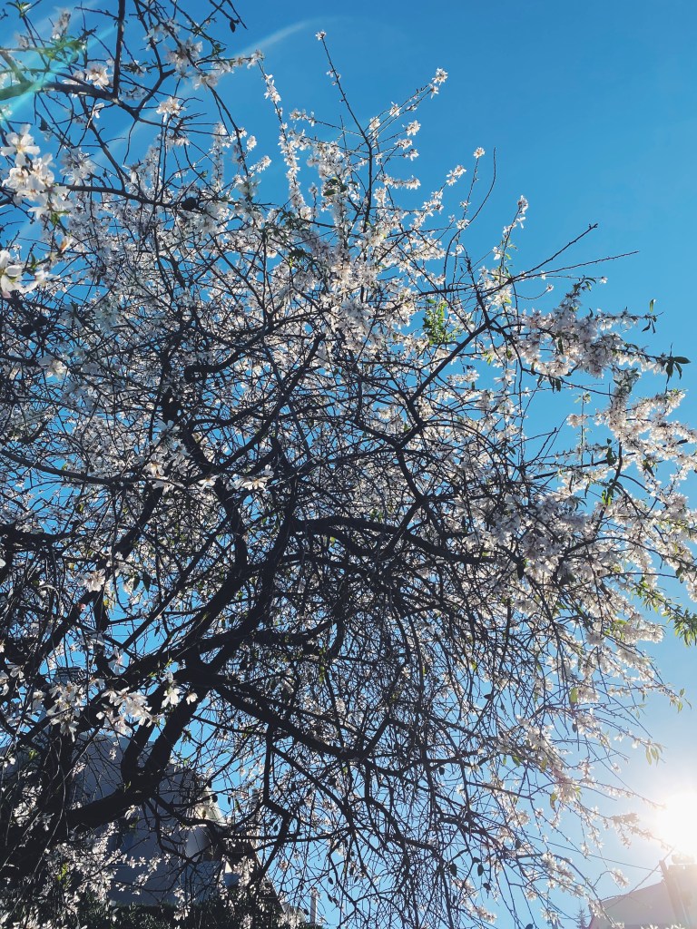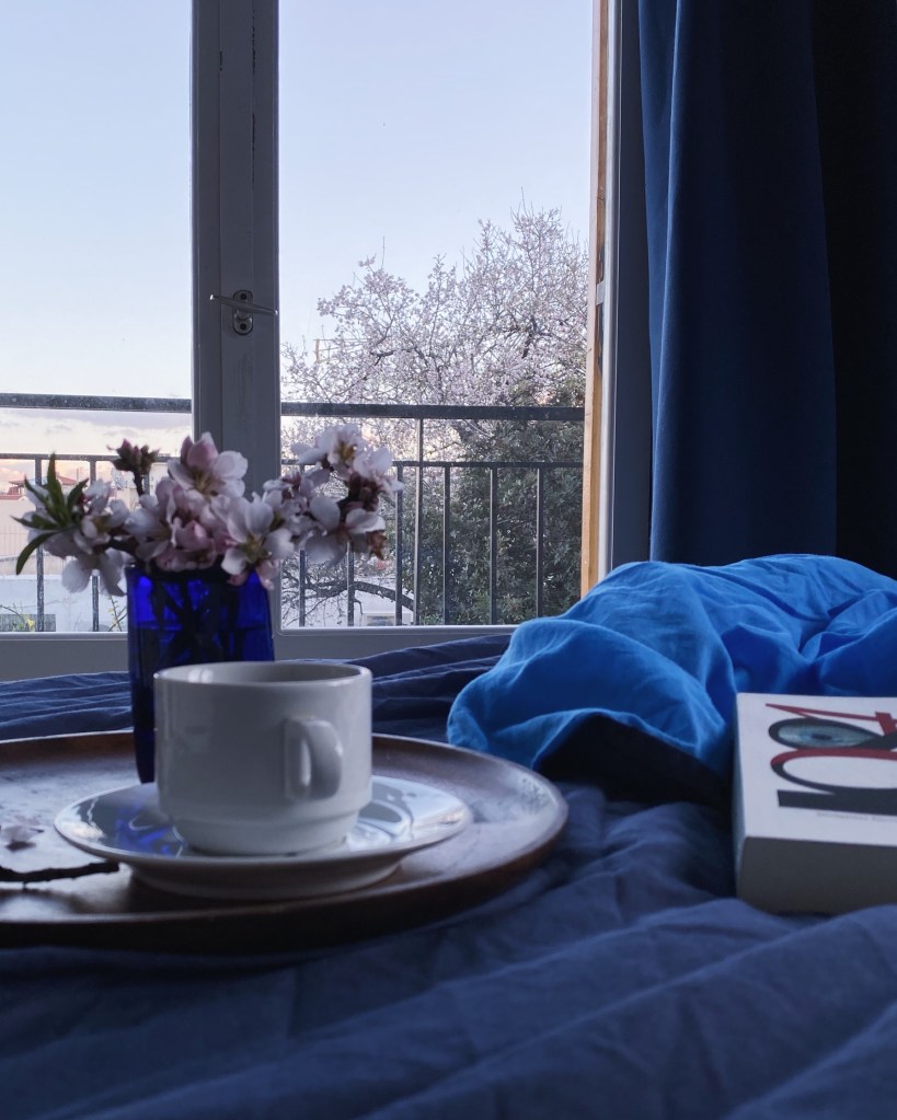 Πίνω το απογευματινό τσάι μου πάντα στο κρεβάτι, διαβάζοντας. Από το παράθυρο του μπλε υπνοδωματίου φαίνεται η ανθισμένη αμυγδαλιά. Χαζεύω τα μικρά λευκά άνθη και τα ροζ μπουμπούκια της. Είναι η αγαπημένη μου καθημερινή ιεροτελεστία αυτή την εποχή, λίγο πριν δύσει ο ήλιος.