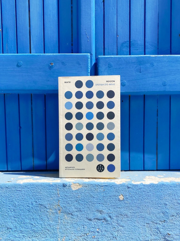«Στον πυθμένα της πισίνας είδα το λευκό φως του χειμώνα να ιριδίζει καθρεφτίζοντας το συννεφιασμένο μπλε και κατάλαβα ότι αυτά τα δύο μαζί φτιάχνουν τον Θεό», γράφει η υπέροχη Μάγκι Νέλσον στο μικρό βιβλιαράκι της για το μπλε.