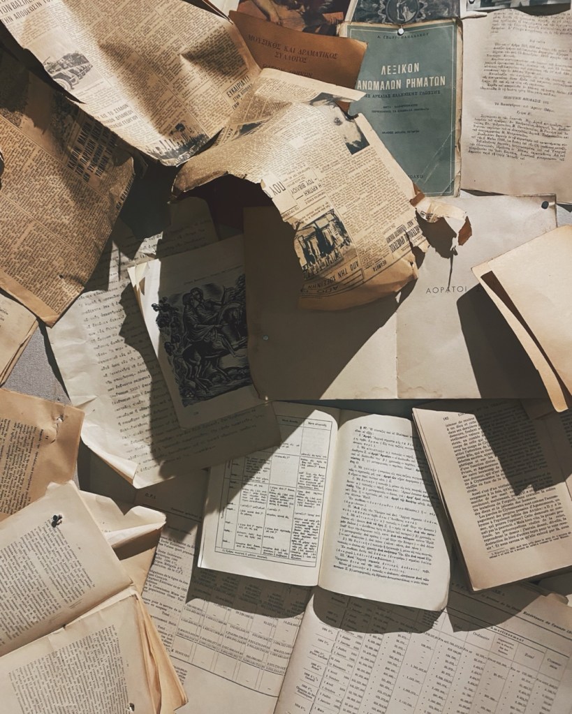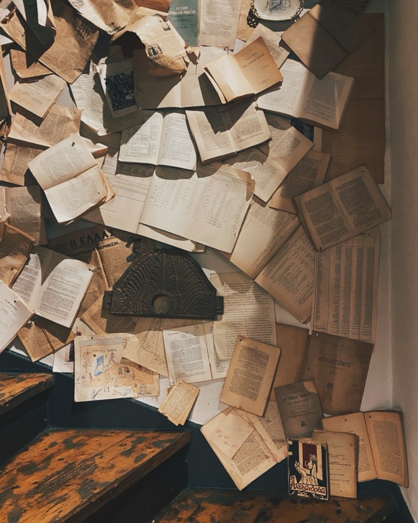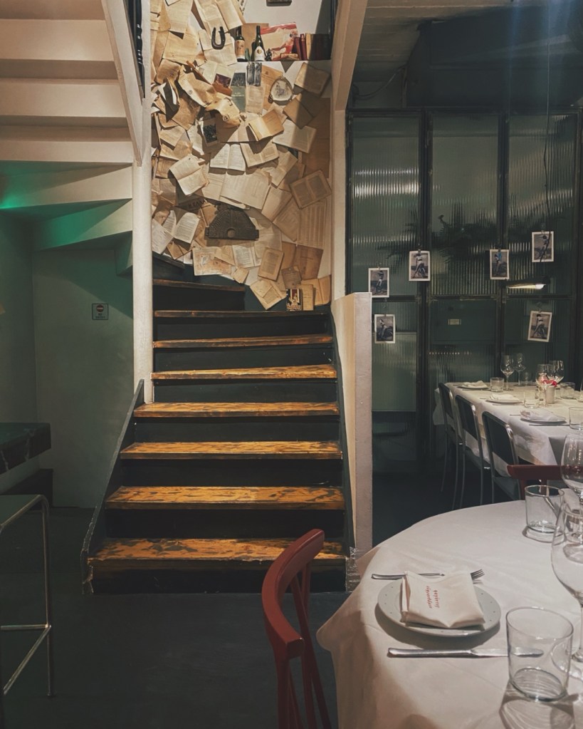 Το σκηνικό: Η σκάλα που οδηγεί στο πατάρι της rogue ταβέρνας Aswtos στην Πλατεία Προσκόπων στο Παγκράτι, όπως προείπαμε, είναι ντυμένη με σελίδες από παλιά βιβλία. Μια ωραία ιδέα διακόσμησης που μου έφτιαξε το κέφι. Μου αρέσει γενικά το ντιζάιν σε αυτό το μαγαζί. Είναι το πιο εμπνευσμένο στην φετινή αθηναϊκή γαστρονομική σκηνή.