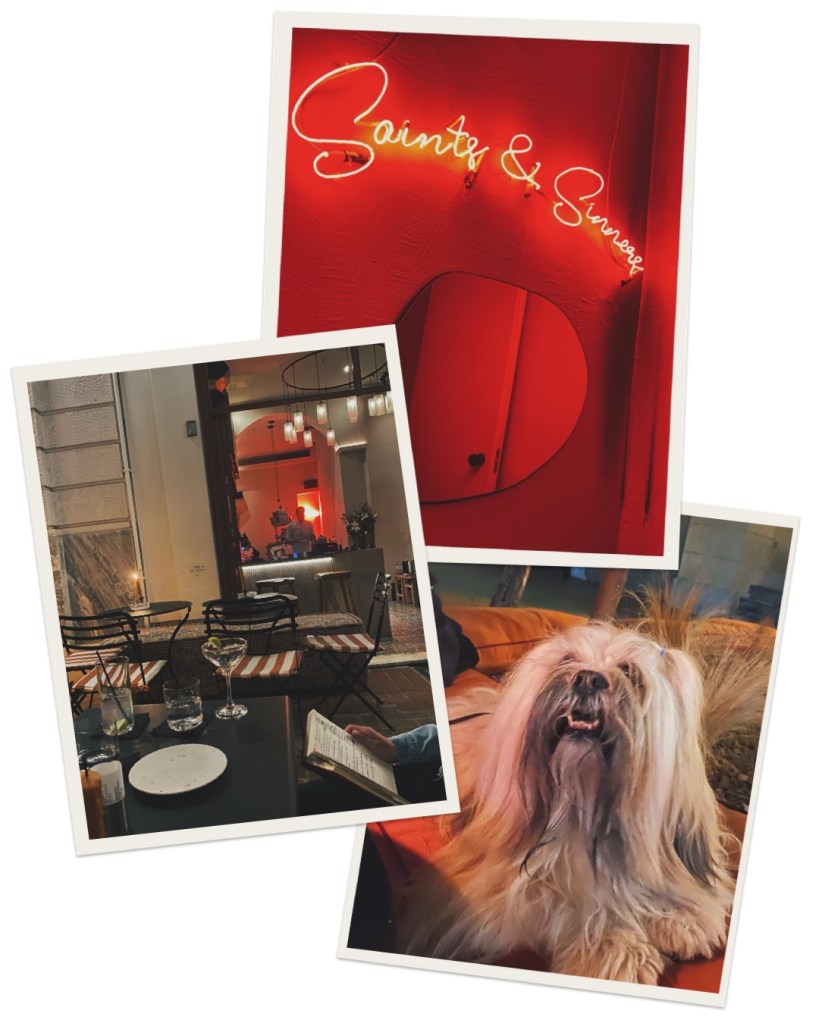 Εμφανές μπετόν, κόκκινες βελούδινες κουρτίνες, ψυχρά inox τραπέζια, τρυφερά γαρύφαλλα, μισολιωμένα κεριά, λάμπες πετρελαίου, vintage βινύλια, γιρλάντες αποξηραμένων βοτάνων και μυρωδικών, ένα hi-tech μπαρ, γιαγιαδίστικες κιτς πορσελάνες, πικάπ, μοναστηριακά τραπέζι, κόκκινες σέξυ καρέκλες του καμπαρέ, συνυπάρχουν με μια δημιουργική αναρχία που είναι τόσο θεατρική, αγύρτικη, αυθάδης, ερωτική και μυστηριώδης, που την ερωτεύεσαι.