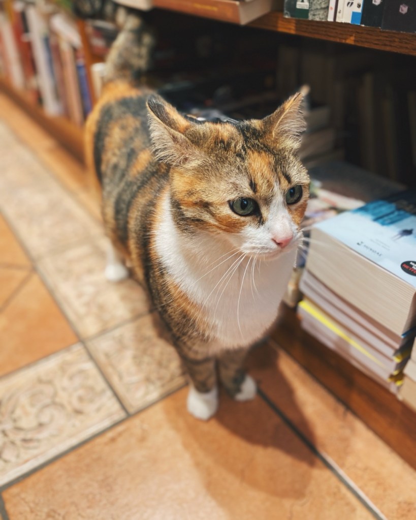 Η γάτα του βιβλιοπωλείου, η περίφημη Μάικο, ήρθε πρώτη να προϋπαντήσει, πήρε τα χάδια της, πόζαρε για τα γνωστά ινσταγκραμικά της καρέ και μετά βγήκε στον πεζόδρομο για χάζι.
