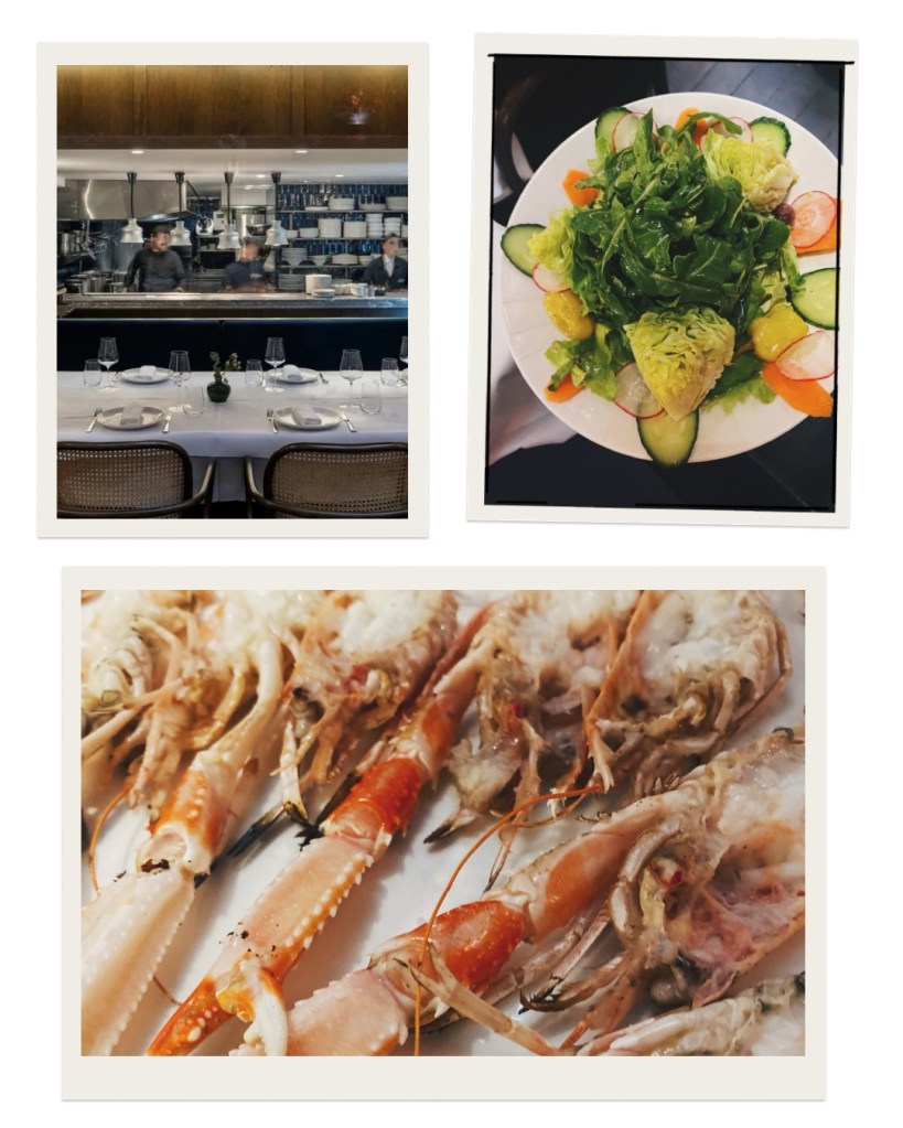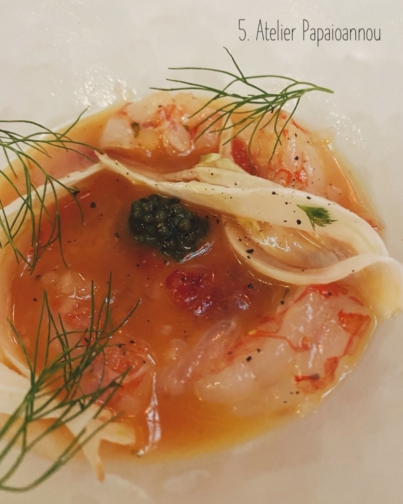 Kαραβίδες, στρείδια, ταρτάρ τόνου, κόκκινες ζουμερές γαρίδες κοιλάδας μαριναρισμένες με εσπεριδοειδή και πασπαλισμένες με φινόκιο και χαβιάρι και άλλα νόστιμα πιάτα με ψάρι και θαλασσινά από τον Κωνσταντίνο Παππά (ανιψιό του Γιώργου Παπαϊωάννου των γνωστών εστιατορίων σε Μικρολίμανο, Κηφισιά, Βουλιαγμένη και Μύκονο). Τη σκορπίνα με τα τσιγαριαστά χόρτα και αχινό που δοκίμασα εδώ ακόμα τη σκέφτομαι! Σκέτη μαγεία.