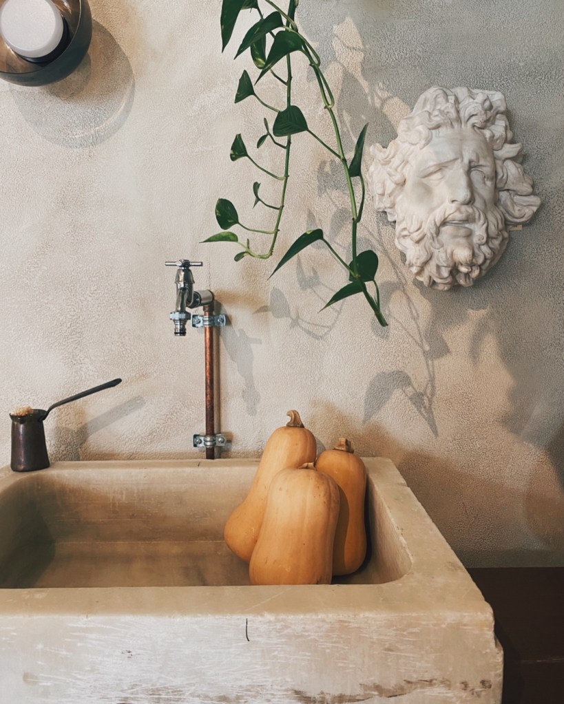 Η διακόσμηση, συνδυάζοντας το inox, το ξύλο και τους shabby τοίχους με φθορές και μισογκρεμισμένους σοβάδες, με τις μονστέρες, τις επιτοίχιες γύψινες αρχαιοελληνικές προτομές, τις πορσελάνες με μπαρόκ σχέδια και ένα γιαγιαδίστικο μαρμάρινο νεροχύτη, είναι ένα ωραίο μεταμοντέρνο παιχνίδι αντιθέσεων που το ερωτεύθηκα.